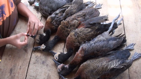 Samedi 24. Passons la matiné;e à arpenter la brousse en 4x4 jusqu'à croiser un groupe de pintades et on lâche le chien. Dé;tour vers un tout petit lac, approche en silence. Il y a des vivis.