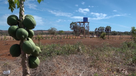 Vue depuis la case. Une pompe puise de l'eau de source très pure.