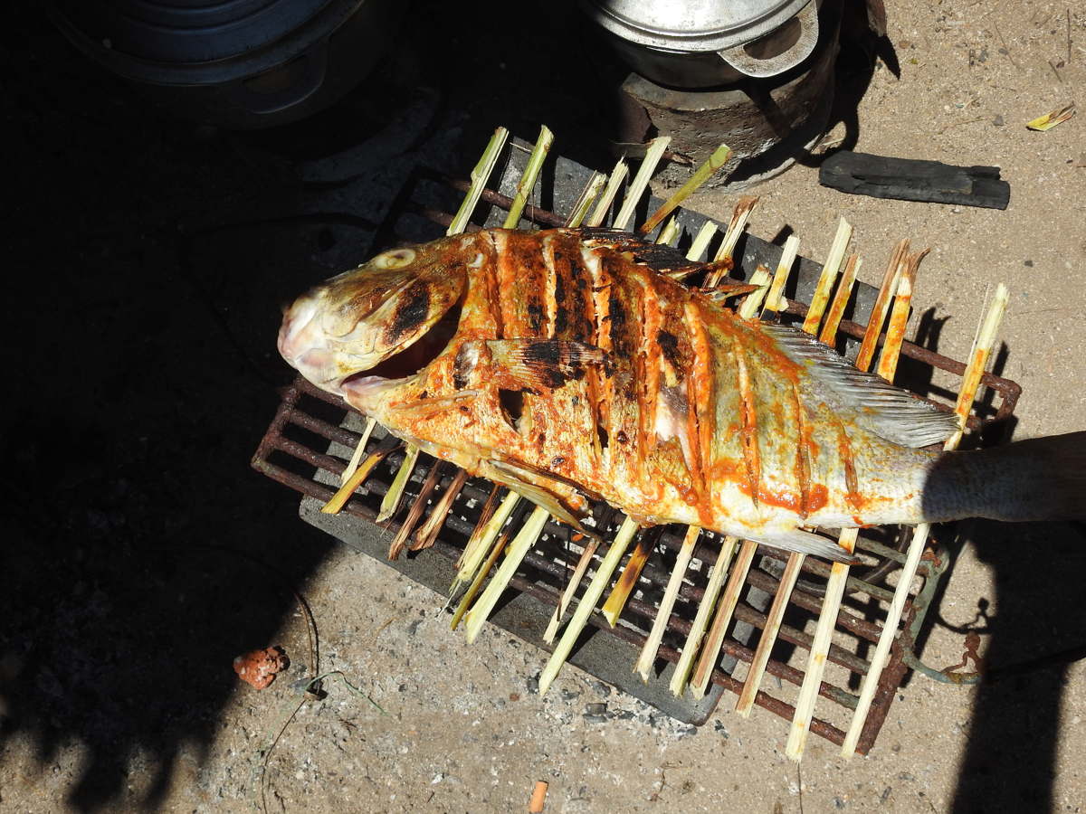 Le diner au camp : Crudités, calamar grillé au beurre citron, calamar sauce, bouillon de coquillages ramassés par les enfants, mérou grillé, riz coco. Pascal est parti seul au sanglier, au même endroit que la veille. Il n'est jamais fatigué, c'est un furieux ! En vain. |