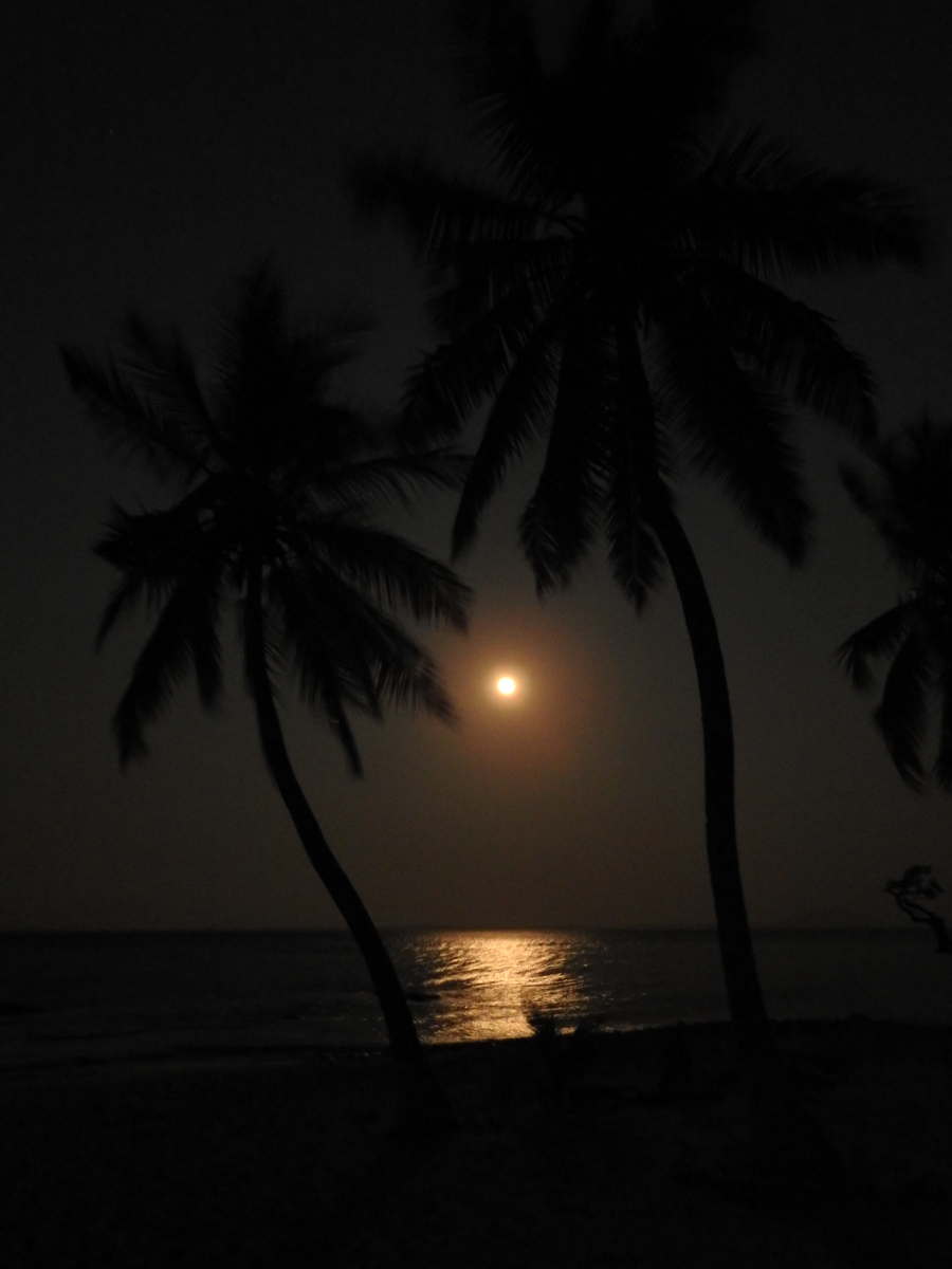 Une bizarrerie sur la plage. Un arbre a parasité un cocotier. Ses racines sont bien implantées dans une cicatrice du tronc et les deux vivent bien, en symbiose... Ci-dessus, la plage vers la droite.