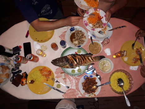 Il est midi, le repas est prêt. Plat de crudités (à chaque repas), brochettes de filet de zébu avec frites, zébu sauce avec du riz, fruits.