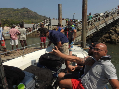 Lundi 7h. Le marin Didier accoste son bateau devant la villa et nous chargeons tout le nécessaire pour notre séjour de 3 jours en brousse. Il est accompagné de sa femme, de son gamin et de son cuistot, William.