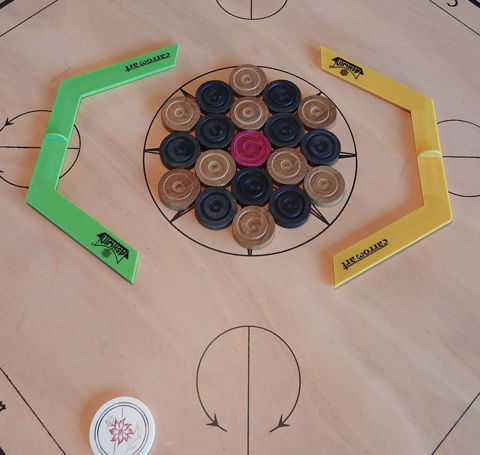 1. DESCRIPTION et BUT DU JEU Le carrom se joue à 2 ou 4 joueurs, (à quatre, les joueurs se faisant face constituent une équipe). A chaque joueur/équipe correspond une couleur : blanc ou noir. La couleur étant déterminée par le premier pion rentré ou par tirage au sort. Le premier qui a rentré tous ses pions dans les trous du plateau est déclaré vainqueur. Il faut savoir que les règles du carrom sont assez controversées. Il existe de multiples règles selon les pays et les régions où chacun y va de son adaptation. Pour que tout le monde joue pareil, celles qui sont présentées ici font référence aux règles officielles de la Fédération Internationale. |