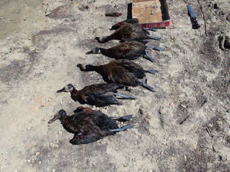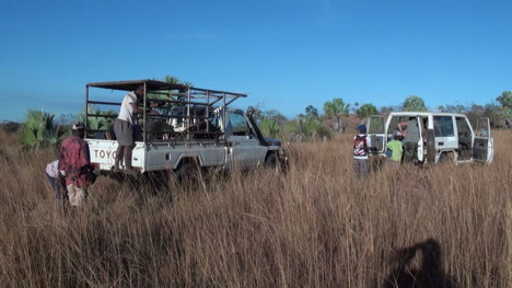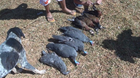 Samedi 24. Passons la matiné;e à arpenter la brousse en 4x4 jusqu'à croiser un groupe de pintades et on lâche le chien. Dé;tour vers un tout petit lac, approche en silence. Il y a des vivis.