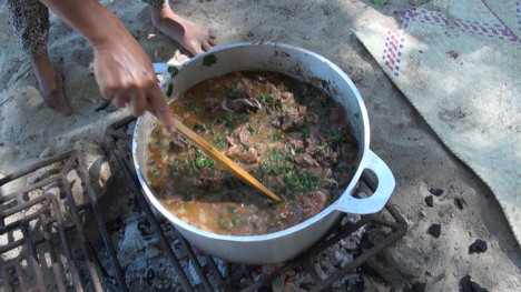 Il est midi à Kaptsety. Ce sera des brochettes en attendant le bac.