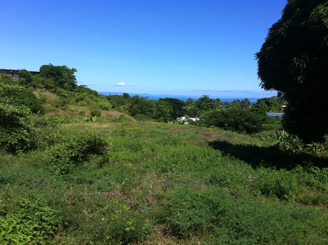 Le premier terrain n'est pas très bien. Ici, le second est beaucoup mieux. Le terrain d'Antoine, le frère du Roi. Imaginez les palétuviers morts arrachés, un canal d'accès pour le bateau et un ponton... Au fond, Nosy Be et Nosy Komba.