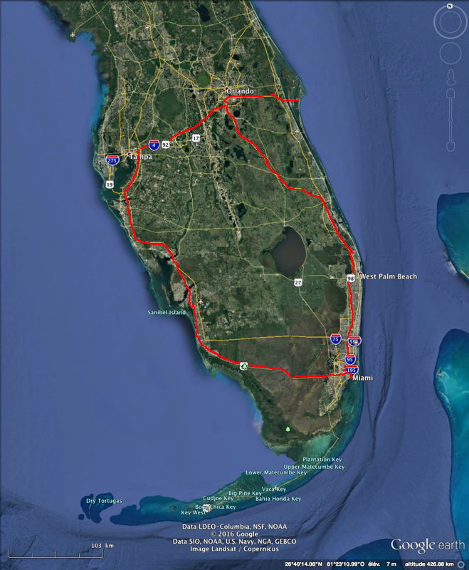 Une arrivée à Miami à 23h après 3h de vol. Le billet n'est pas cher, 42 dollars, mais il faut ajouter 50 dollars par valise ! Le temps de récupérer une voiture chez Rentalcars (ne pas oublier de prendre un pass pour les autoroutes) et nous voilà à minuit à chercher l'hôtel que l'on a reservé (merci Booking). Nous nous sommes pas mal perdu dans différents quartiers, plus de 2h... (je n'ai pas voulu prendre le GPS. A l'ancienne !) Le parcours nous fait aller sur Orlando par la côte Est et revenir à Miami par l'Ouest. |