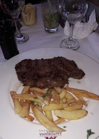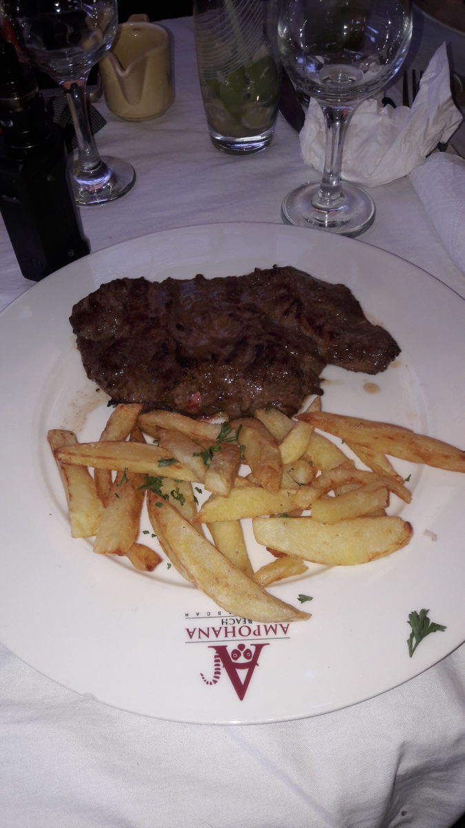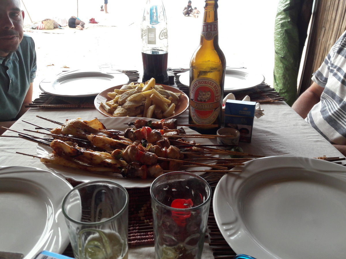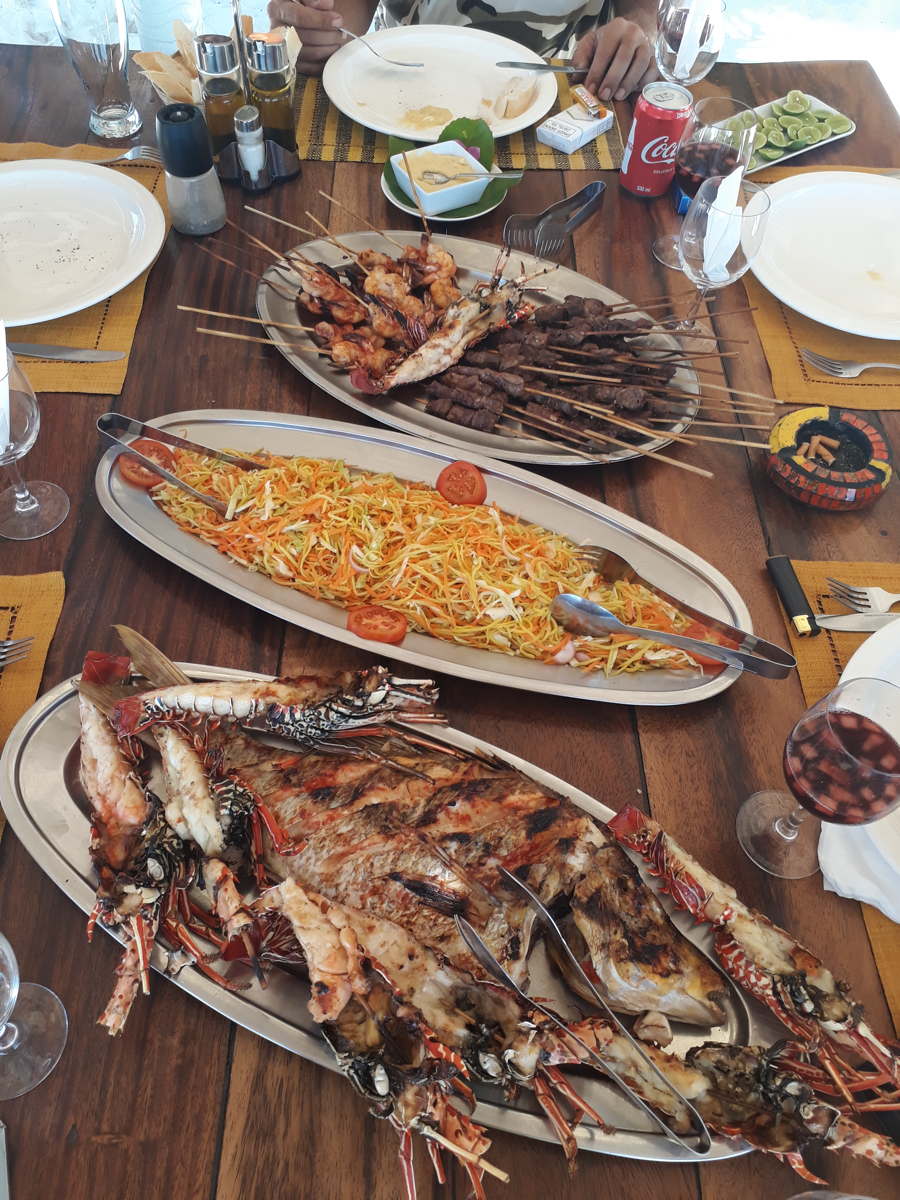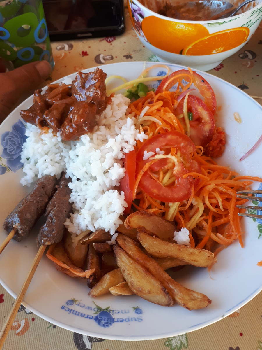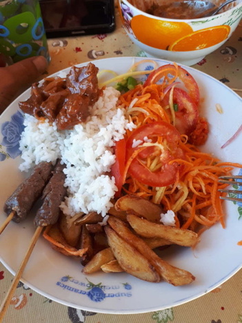 Il est midi, le repas est prêt. Plat de crudités (à chaque repas), brochettes de filet de zébu avec frites, zébu sauce avec du riz, fruits.