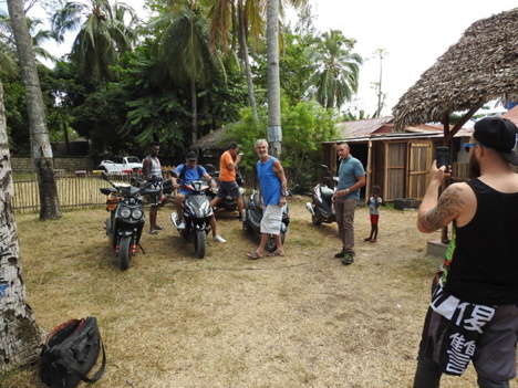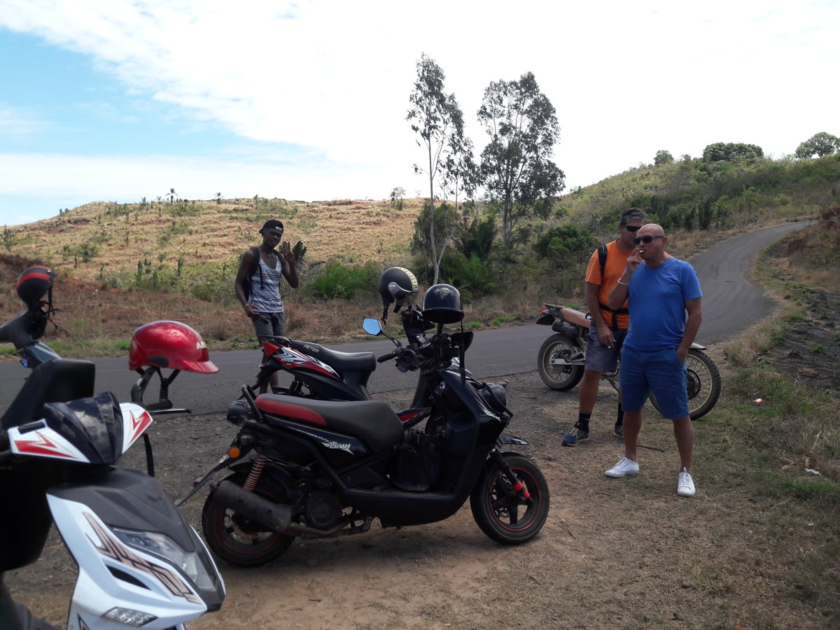 Jour 2, dimanche donc, nous avons prévu de faire le tour de l'île aux parfums. Non sans mal nous trouvons 5 motos à louer à Ambaro (environ 8€ la journée). Adamo, notre jeune guide que connait David, nous accompagne.