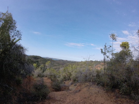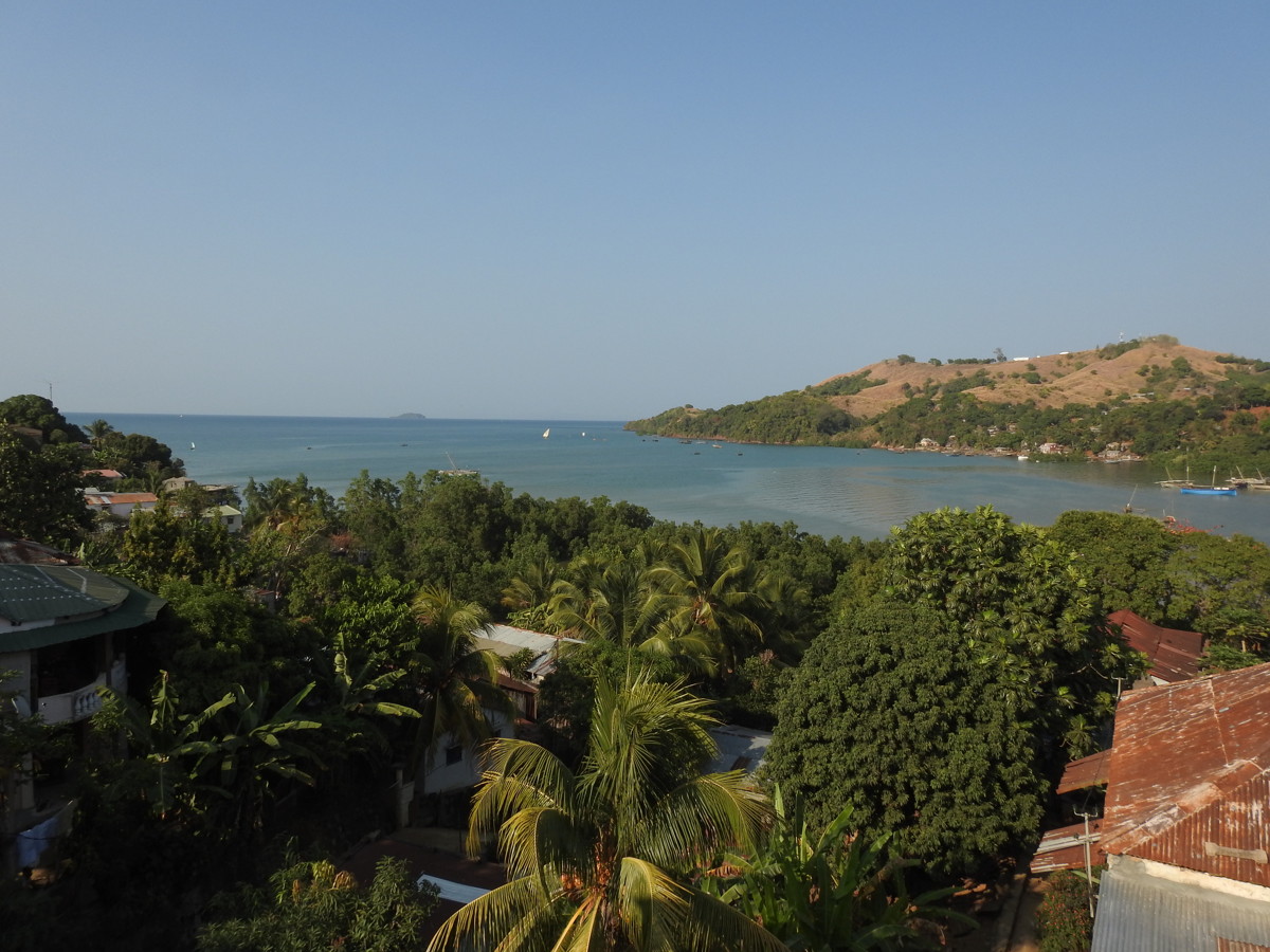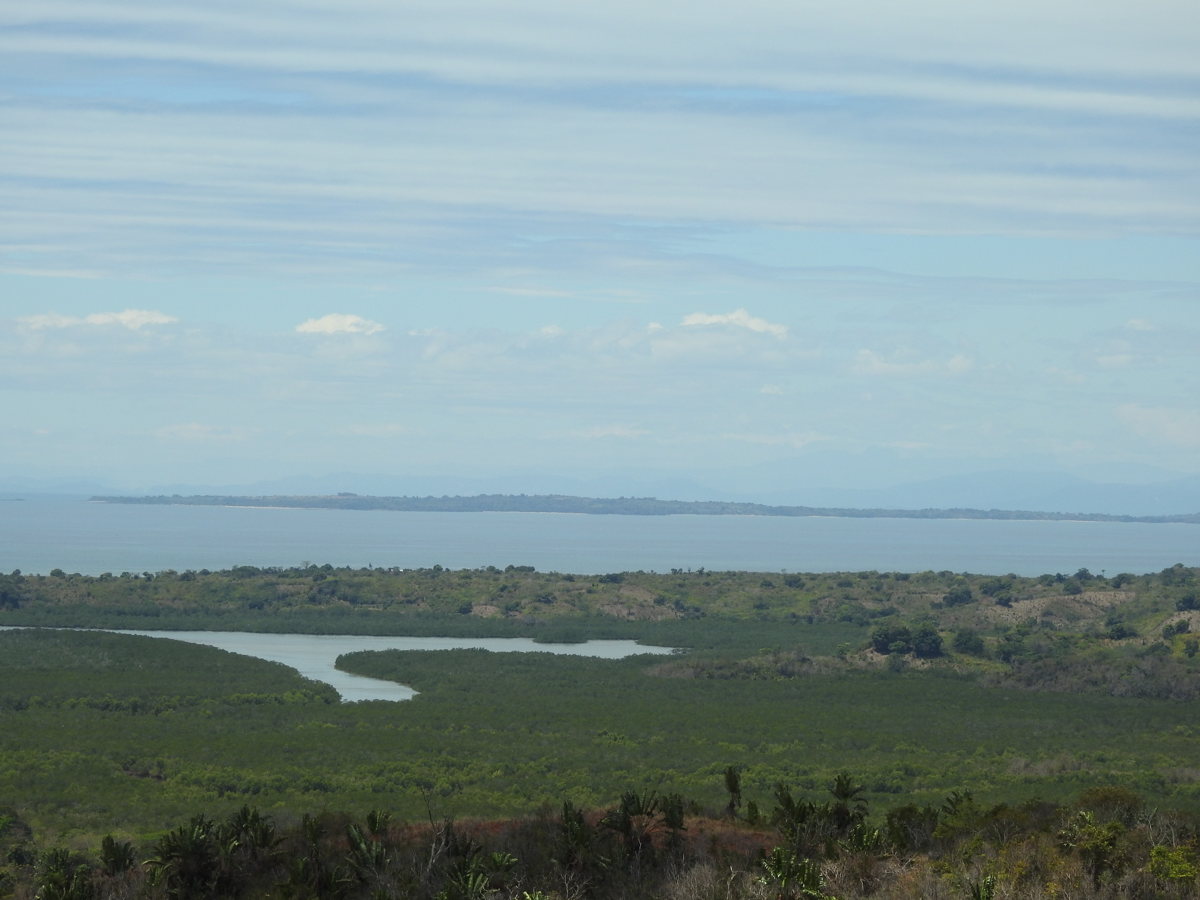 La vue en face. La pointe sud de la baie des Russes, au bout la petite île privée d'Ankazoberavina et un petit pain de sucre.