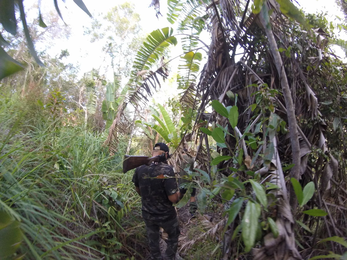 A la tombée de la nuit nous rentrons au camp pour déguster un civet de canard la cour. On va ensuite sur un poste à sanglier à une demi-heure de marche. L'endroit est joli mais très étriqué et enchevêtré, peu de dégagement et de vue. On attend dans le silence total, ils ne viennent pas. |