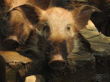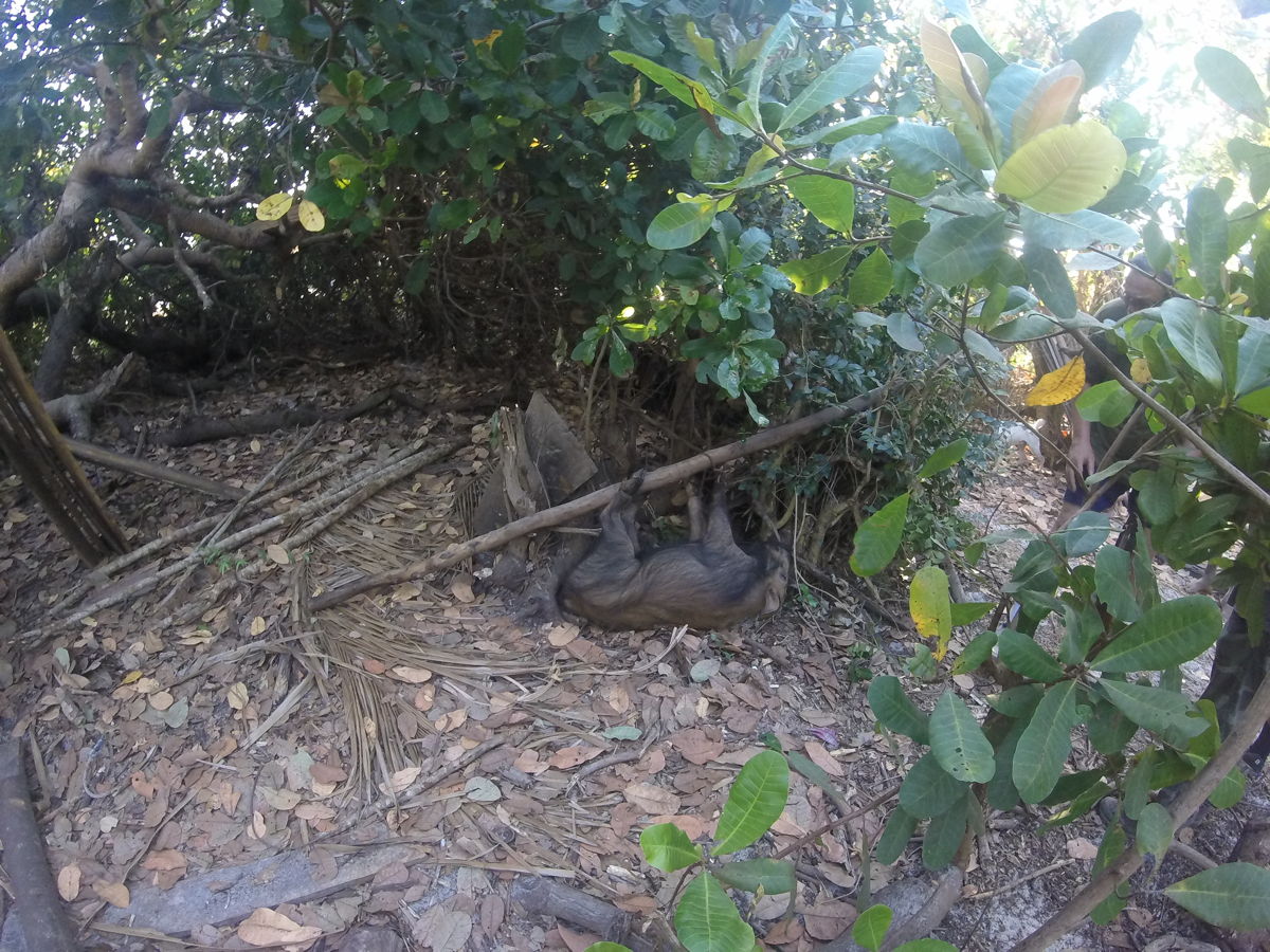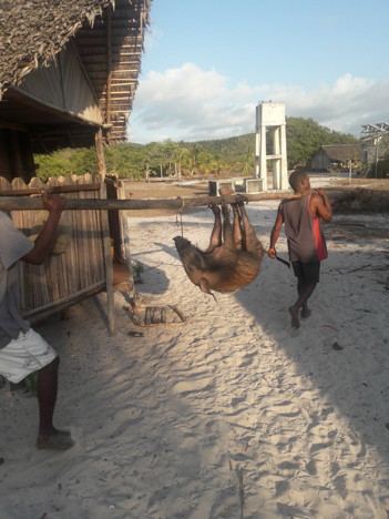 Sur le chemin du retour nous croisons un homme qui a piégé un sanglier, un potamochère. Il veut nous le vendre. Nous ne discutons pas, 70.000 Ar, moins de 20 euros pour bien 35 kg de viande une fois vidé. |