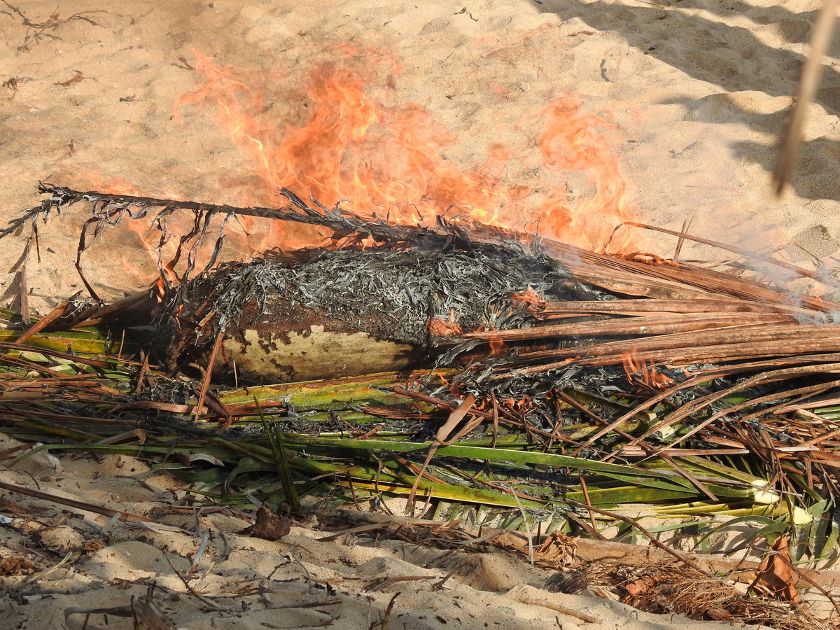 Arrivé au village, une lame dans le coeur et traditionnel passage dans les flammes pour gratter les poils. Découpe de la viande et mise en glacière des beaux morceaux avec du gros sel.