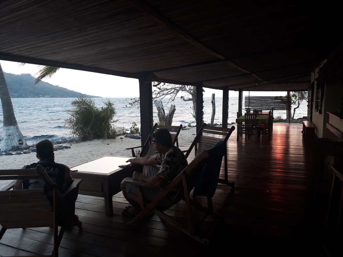 Une belle villa pieds dans l'eau avec le personnel, une affaire sympathiquement négociée à 100 euros la nuit. Apéro sur la terrasse face à la mer. |
