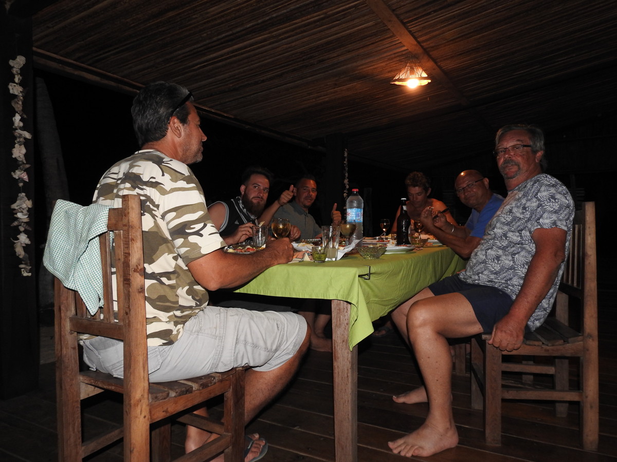 Le diner au camp : Crudités, calamar grillé au beurre citron, calamar sauce, bouillon de coquillages ramassés par les enfants, mérou grillé, riz coco. Pascal est parti seul au sanglier, au même endroit que la veille. Il n'est jamais fatigué, c'est un furieux ! En vain. |