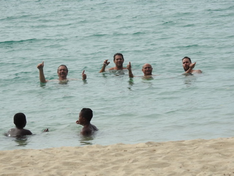 | La plage avec, sur la gauche, des départs de touristes pour les excursions sur les îles. Enormément d'italiens (3 avions par semaine de Rome !).