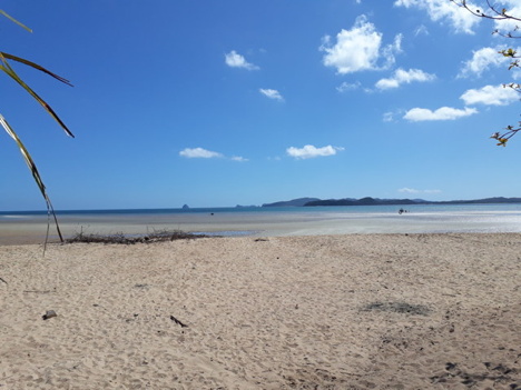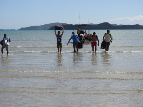 Après 1h30 de navigation, au sud de la Baie des Russes, nous accostons à marée basse. Il faut marcher et porter...