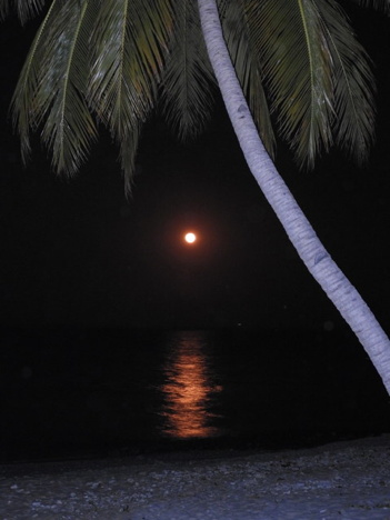 Une bizarrerie sur la plage. Un arbre a parasité un cocotier. Ses racines sont bien implantées dans une cicatrice du tronc et les deux vivent bien, en symbiose... Ci-dessus, la plage vers la droite.