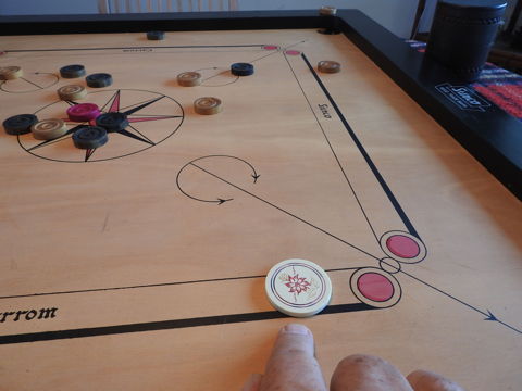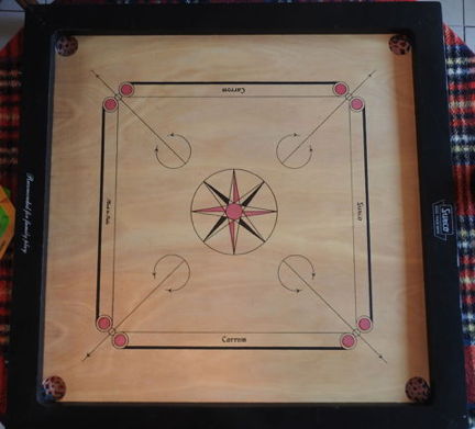 Le Carrom ou Carom, Carums, Karum, Carambole ou encore Billard indien est un jeu ancien dont on ne connaît exactement l'origine. Une table de carrom ressemble à un mini billard fait en bois avec des trous dans chaque coin. Sur ce plateau se déplacent 9 pions blancs, 9 pions noirs, un pion rouge (la Reine) et un palet plus grand : le percuteur. C'est à l'aide du palet que l'on joue les pions en essayant de faire rentrer ceux de sa couleur dans les trous. |
