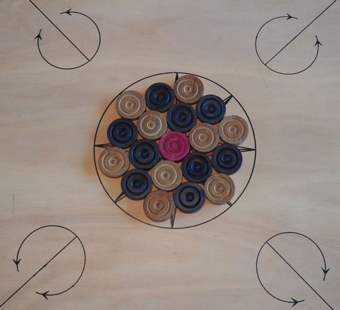 Cette variante peut se jouer à deux, trois ou quatre joueurs puisque ici, aucun joueur n' a de couleur des pions. En fait, chaque couleur correspond à une valeur de points : un pion noir vaut 5 points, un pion blanc vaut 10 points et la Reine (le rouge) vaut 25 points. But du jeu Pour gagner la partie, il faut être le joueur qui possède les 4 trous du plateau en les ayant achetés. Disposition des pions au départ : Mettre la Reine au centre de la rosace et l' encercler de six pions (3 noirs, 3 blancs). Les pions restants sont empilés sur la Reine en intercalant noirs et blancs. La partie le but du jeu étant d' acheter des trous, chaque trou aura une valeur d' achat et de rachat. Pour acheter un trou, le joueur doit avoir sorti des pions dont la somme de leur valeur respective atteint 25 points minimum. Il choisit alors un des quatre trous, l' achète et remet en jeu les pions correspondant aux 25 points, empilés sur le centre de la rosace. Pour racheter un trou appartenant à un autre joueur, il faut totaliser 60 points et remettre en jeu, les pions correspondant à cette somme, empilés au centre. Important : l' achat ou le rachat de trou ne peut être effectué qu' au trou suivant l' acquisition des points nécessaires. Faute : lorsqu' un joueur fait tomber le percuteur dans n'importe quel trou, il perd le ou les trous achetés ainsi que tous les pions qu'il avait sortis du jeu. Alors maîtrisez vos percuteurs ! |